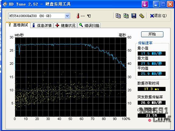 见到IBM的硬盘盒后感觉还行,以前就知道是塑料的,所以也没在意外观的东西,正面的手感不错,打开硬盘里面看着那些芯片蛮爽的,符合网上验证正品的帖子上所说的特征,让小吴(看年龄应该不是老吴)帮我装了盘格了盘,看看附件都齐全,走人,呵呵,硬盘包不错,看起来很漂亮,里面的连接线做的也很细致,应该是精心制作的产品,回来后连上我的联想125,用HDTUNE2.52测试结果如图,很满意,接着拷了13G的电影进去,历时11分50秒,不过这个数据是在开着诺顿的情况下得出的也许没有参考价值,总体还算满意,除了价钱以外,呵呵。中午4点入手到现在3个小时,感觉不错,没必要评价太多,毕竟只是一个移动硬盘而已,呵呵。
