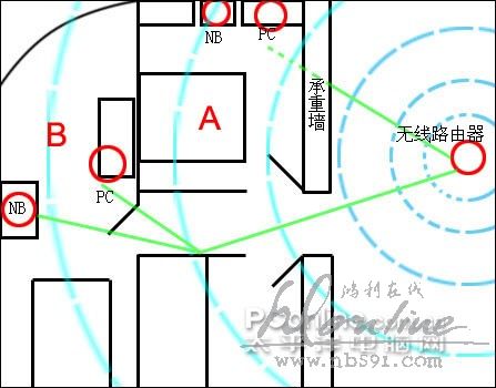 传输测试点为A房间和B房间的PC机,A房间使用贝尔金USB网卡,B房间使用磊科PCI无线网卡。
