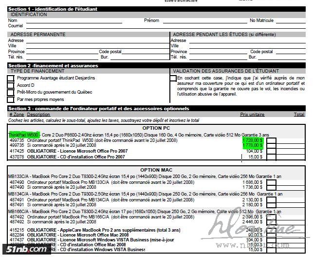 下面是University Laval所提供的订购单,如果在7月20日之前订购的话,价格为1728美元,但如果是在7月20日之后的话,则要1778美元(本人不懂法语,如果有讲错的地方,请指正)。从时间上看,ThinkPad W500的发布可能是在7月20日前后。