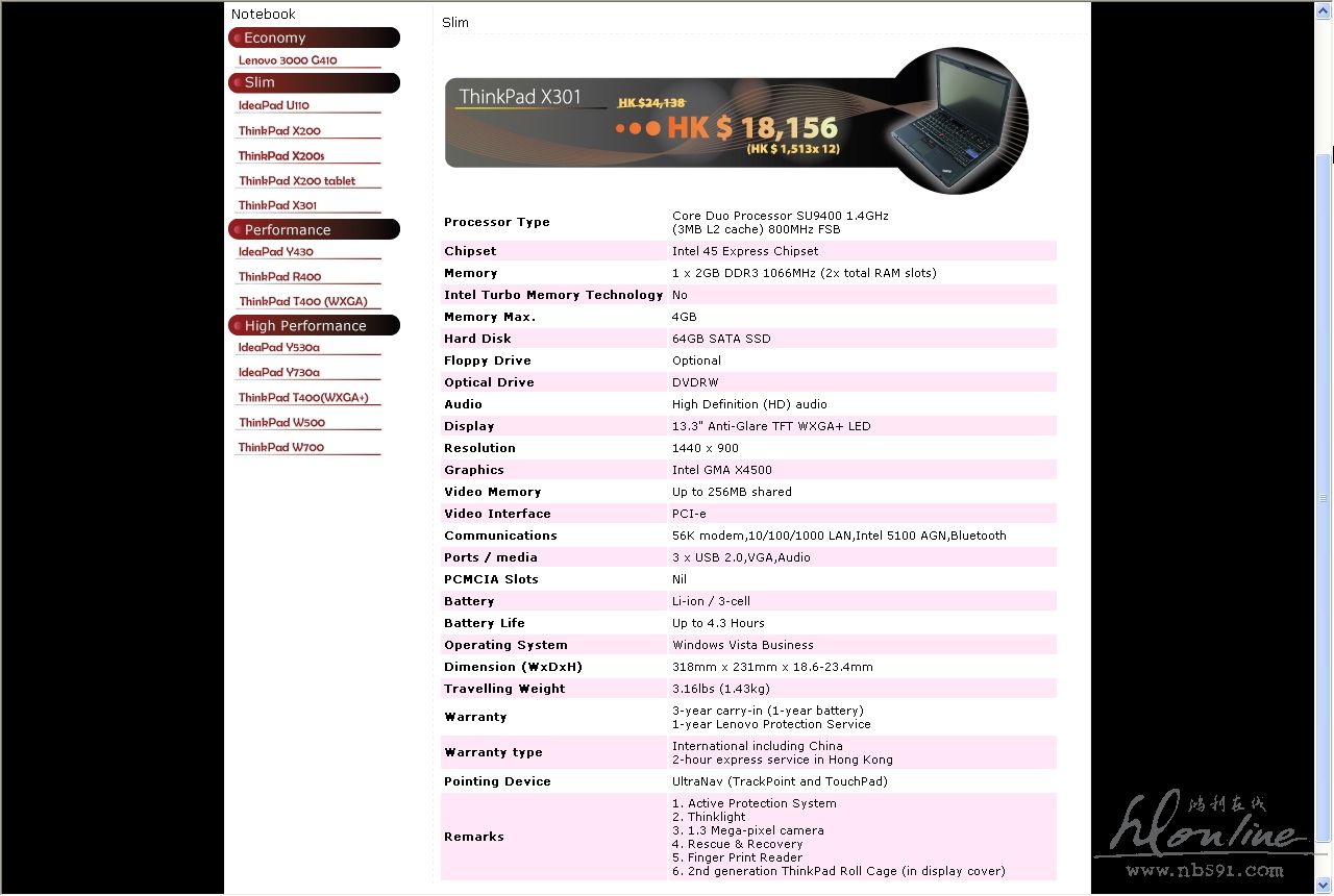 | Remarks | 1. Active Protection System 2. Thinklight 3. 1.3 Mega-pixel camera 4. Rescue & Recovery 5. ThinkPad Roll Cage 6. Finger Print |