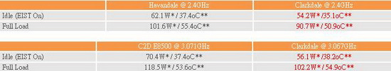 * 功耗数值为整机功耗而非纯处理器功耗,以往仅处理器功耗测试只会完全负责处理器核心,但 Clarkdale 内建绘图核心,因此 Full Load 测试改以 3D Mark Vantage 并以 Watts up Pro 记录最整个功耗最高点。