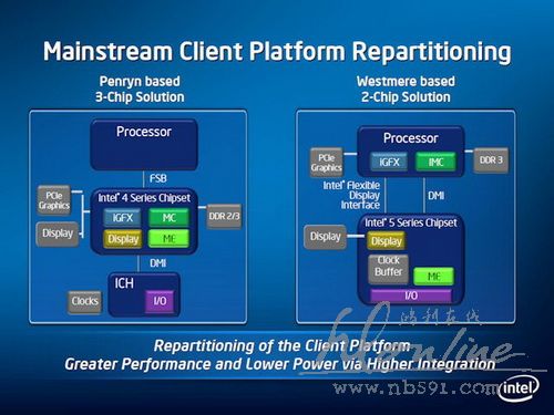 Paul 也进一步举例说明,原定 2010 年第一季初推出的是 45nm 制程 Havendale 处理器, x86 处理核心与集显核心均为 45nm 制程,但由于 32nm 制程 Westmere 核心比预期提早成熟,因此 Intel 把 45nm 制程的 Havendale 取消,直接更新处理核心至 32nm Westmere ,但却保留 45nm 制程的显示核心,令 Clarkdale 能提前上市。$ V- o. `+ F) y+ J( _