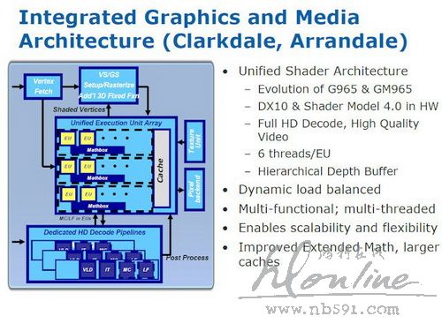 Clarkdale 显示核心基于 G965/GM965 的 GMA (Graphics Media Accelerator) 显示架构,硬件支持 Direct X 10 、 Shader Model 4.0 及 OpenGL 2.0 规格,显示核心采用 Unified Shader 设计,每一组 Execution Units 均可执行 Vertex 、 Geometry 及 Pixel Shader 指令。' Y. E" D9 I6 @& O0 u9 W3 w