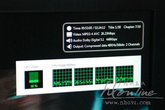 我们同时采用 Cyberlinke PowerDVD 9 及 Arcosoft TotalMedia Theather 播放两组 40Mbps 的 MP4 影片,采用上代 Intel G45 芯片组下处理器会被完全负载,但 Intel Clarkdale 显示核心则令处理器资源使用率仅 16-24% ,效果令人满意。7 t4 @$ G- P$ U8 ]$ d