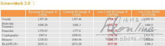 ScienceMark 2.0 虽然能认出 Clarkdale 双核心支持 4 个线程,但由于 Hyper-Threading 技术并不是真正的四核心运算,面对主要采用 ALU 运算的 SciencMark 2.0 , Hyper-Threading 其实效能提升并不明显,因此 Clarkdale 处理器在 Science Mark 2.0 之中并没有显优势。