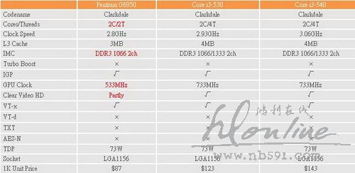 售价方面, Pentium G6950 、 Core i3-530 及 Core i3-540 千颗单价分别为 $87 、 $123 及 $143 美元。